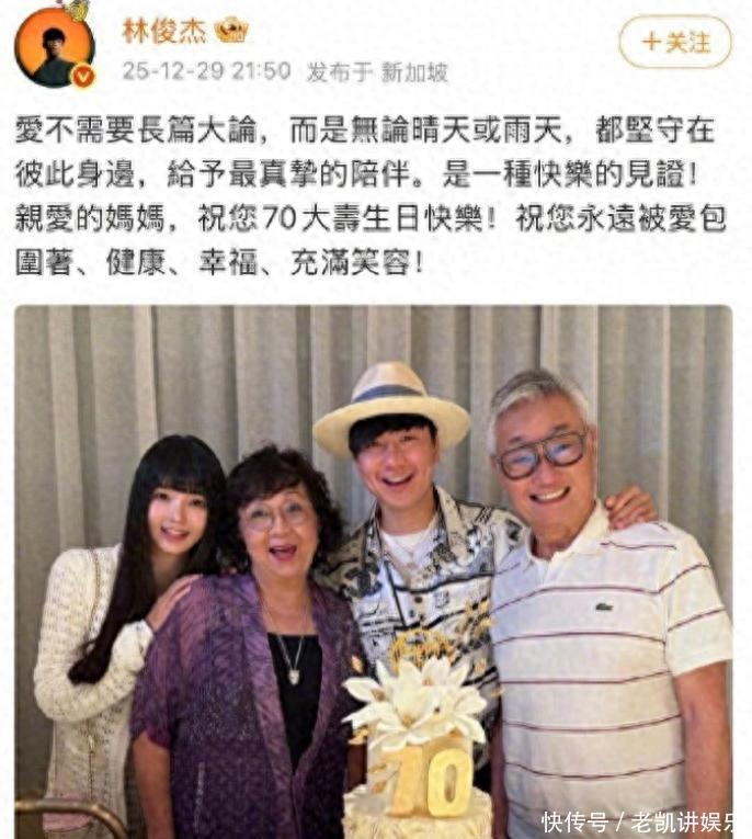 这照片主要是为了给母亲庆祝70岁生日。值得注意的是林俊杰的旁边站着一位年轻的女性。